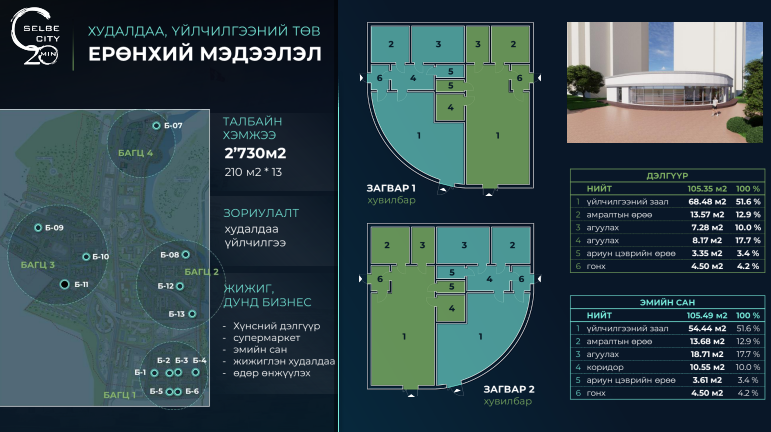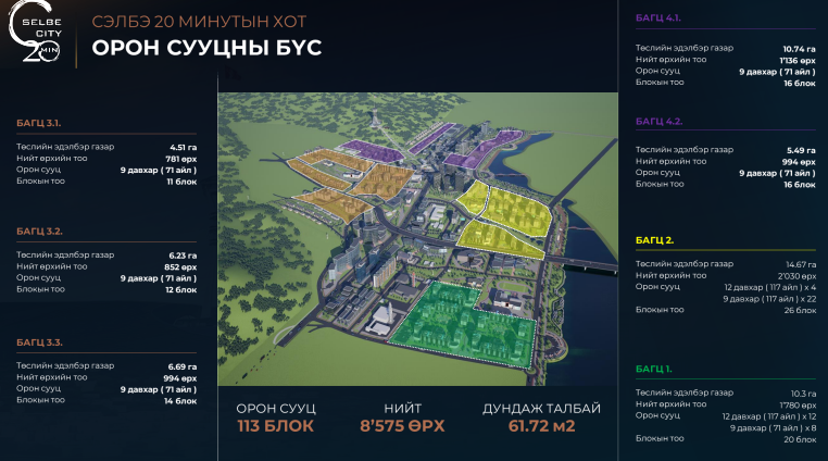Төслийн хүрээнд нийт 113 блок бүхий 8575 айлын орон сууц, үйлдвэрлэл үйлчилгээний бүс, ерөнхий боловсролын 3 сургууль, 5 цэцэрлэг, эрүүл мэндийн төв байгуулж, Сэлбэ голын дагуу 1.5 км урттай байгалийн тэнцвэрийг хадгалсан амралт, чөлөөт цагийн ногоон бүс бүтээн байгуулахаар төлөвлөсөн.