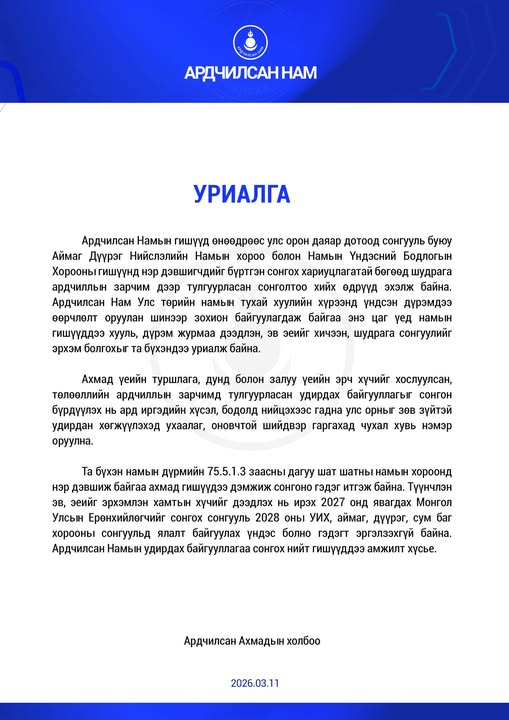 Тус уриалгад “Ардчилсан Намын гишүүд улс орон даяар дотоод сонгууль буюу Аймаг Дүүрэг Нийслэлийн Намын хороо болон Намын Үндэсний Бодлогын Хорооны гишүүнд нэр дэвшигчдийг бүртгэн сонгох хариуцлагатай бөгөөд ардчиллын шударга зарчим дээр тулгуурласан сонголтоо хийх өдрүүд эхэлж байна.