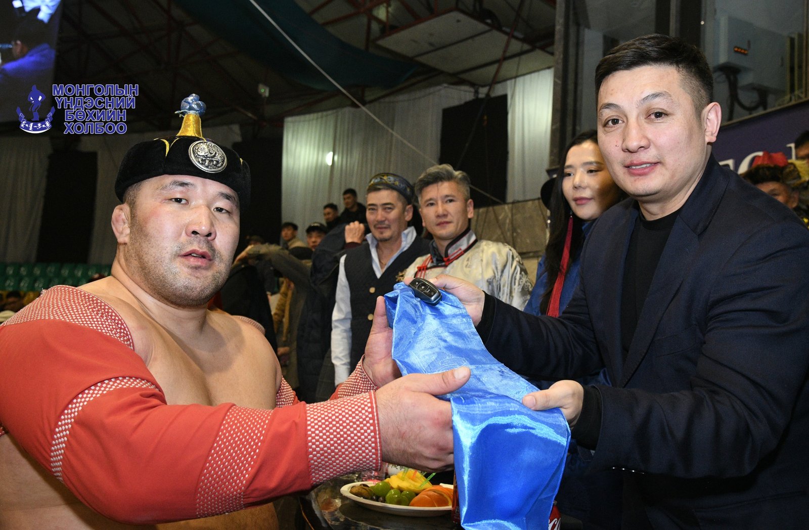 Нэрэмжит барилдаанаа зохиож буй Улсын харцага О.Бахытад МҮБХ болон хамт барилдаж явсан үе тэнгийн бөхчүүд, шавь нар, найз нөхөд, нутаг орныхон зэрэг олон хүмүүс хүндэтгэл үзүүлж байлаа.