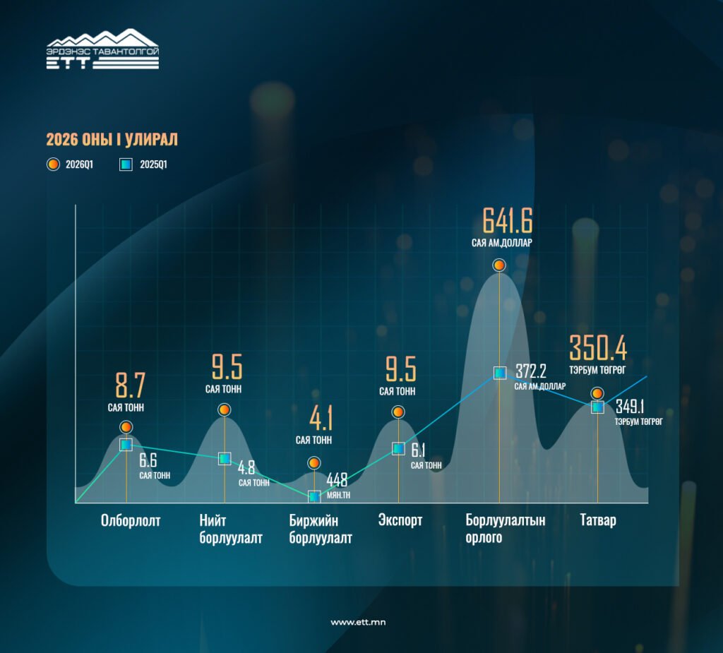 Экспорт 2026 оны 1 дүгээр улиралд 9.5 сая тоннд хүрч өмнөх оны нэгдүгээр улирлын экспортын хэмжээнээс 56% өссөн байна. Үүний 51% буюу 4.9 сая тонн нүүрс нь хүргэж өгөх нөхцөлтэй биржийн экспорт, 49% буюу 4.6 сая тонн нүүрс нь урт хугацаат буюу ам нөхцөлтэй гэрээний нүүрс эзэлж байгаа аж.