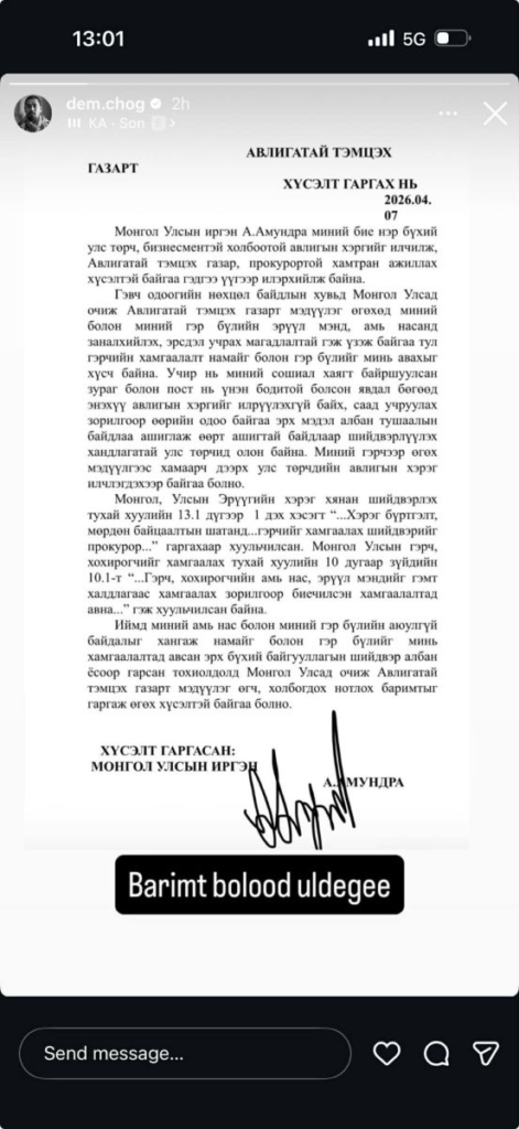 “Бодь интернэшнл”-ийн Гүйцэтгэх захирал асан А.Амундра өнөөдөр /2026.04.07/ инстаграмаараа дамжуулан гэрчийн хамгаалалтад авбал Авлигатай тэмцэх газарт эрх баригч МАН-ынхны авлигын асуудлаар гэрчийн мэдүүлэг өгөхөд бэлэн байгаагаа илэрхийлэв.
