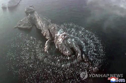 (2026 оны дөрөвдүгээр сарын 19-ний өдөр Хойд Солонгост хийсэн туршилтын харвааны үеэр кластерийн бөмбөгт байлдааны толгой суурилуулсан Hwasong-11 Ra тактикийн баллистик пуужин зорилтот байг онож буйг харуулсан уг зургийг маргааш нь Солонгосын Төв Мэдээний Агентлаг нийтэлжээ)