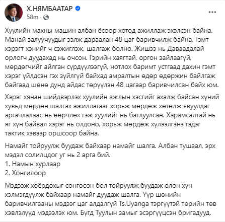 Мэдээж хоёрдохыг сонгосон бол тойруулж буудаж олон хүн хэлмэгдүүлж байхаар намайг дуудаж шалга. Үүр шөнийн баривчилгааны мэдээг цаг алдалгүй Ts.Uyanga тэргүүтэй төрийн төв хэвлэлүүд мэдээлэх юм. Бүгд Туулын замыг эсэргүүцсэн бригадууд” гэжээ.